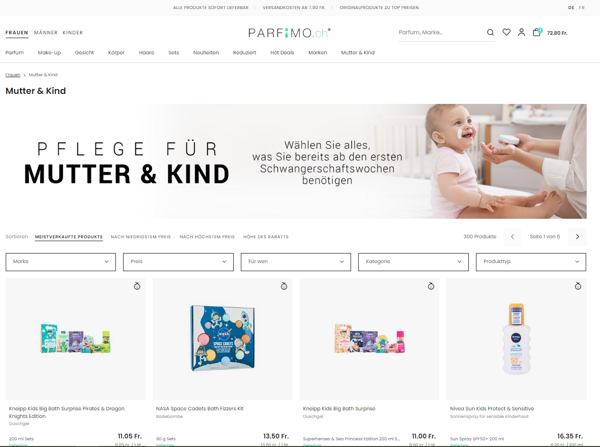 Parfimo.ch hat ihr Sortiment um eine neue Kategorie erweitert. Mutter & Kind heißt die neue Sektion und sie bietet ein breites Angebot an Produkten, die für werdende Mütter und Eltern von Kleinkindern gedacht sind.